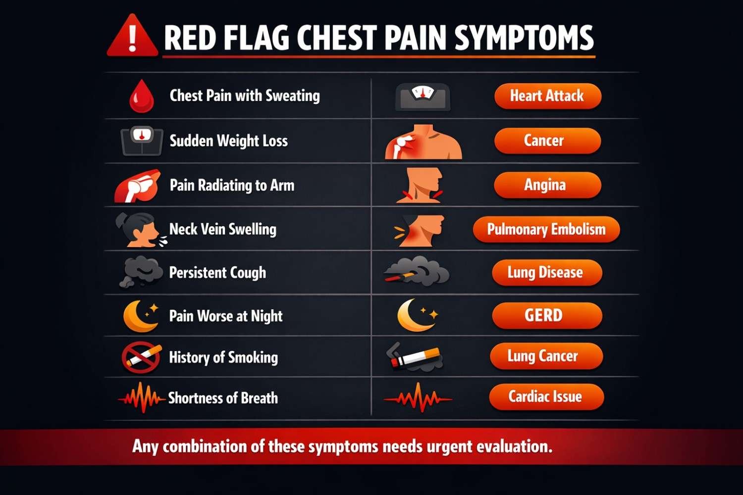 | Chest pain + unexplained weight loss | Lung cancer, mesothelioma |
