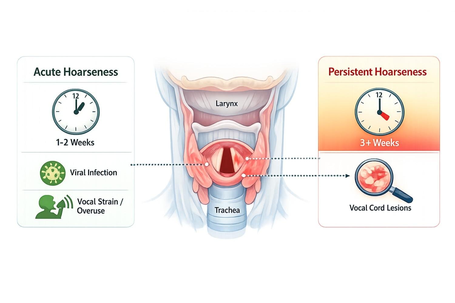 Here is why the three-week mark is the threshold: viral infections and minor irritation almost always clear up within 14 days. Persistent hoarseness beyond three weeks means something structural, neurological, or oncological may be at play.