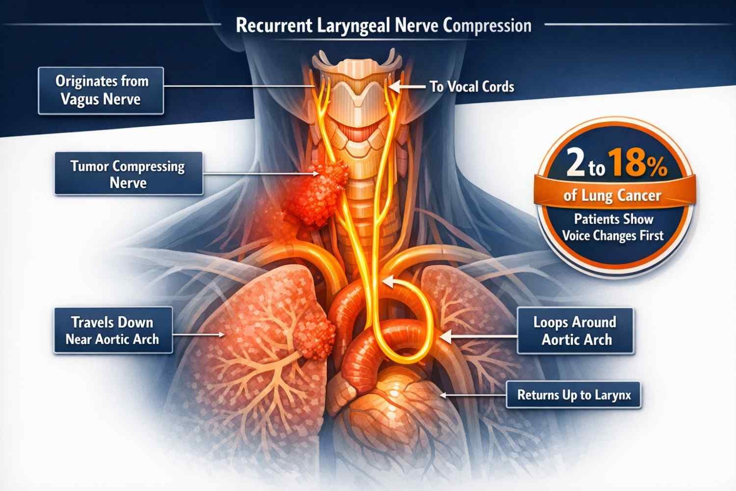 If a lung tumor forms near the upper-left lung, it can press on this nerve. When that happens, one vocal cord becomes weak or partially paralyzed. The result is persistent hoarseness, often without any throat pain, sore throat, or infection. Research has found that 2 to 18% of lung cancer patients experience voice changes before any other symptom appears. In some cases, the only early warning sign is a change in voice.