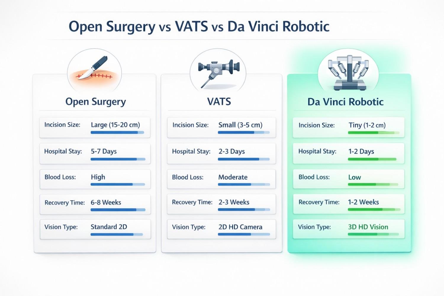 | Factor | Open Surgery | VATS | Da Vinci Robotic |