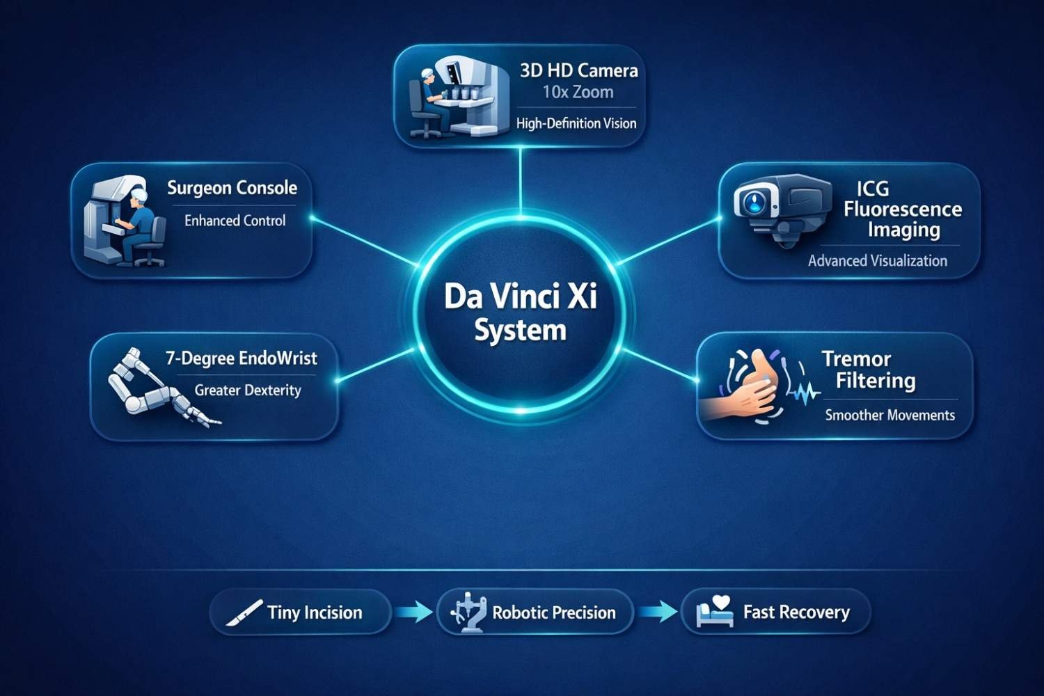 When ICG is injected into the bloodstream, it glows bright green under infrared light at the surgeon's console. This makes blood vessels, lymph nodes, and tissue boundaries visible in ways that no other technology currently offers during live surgery.
