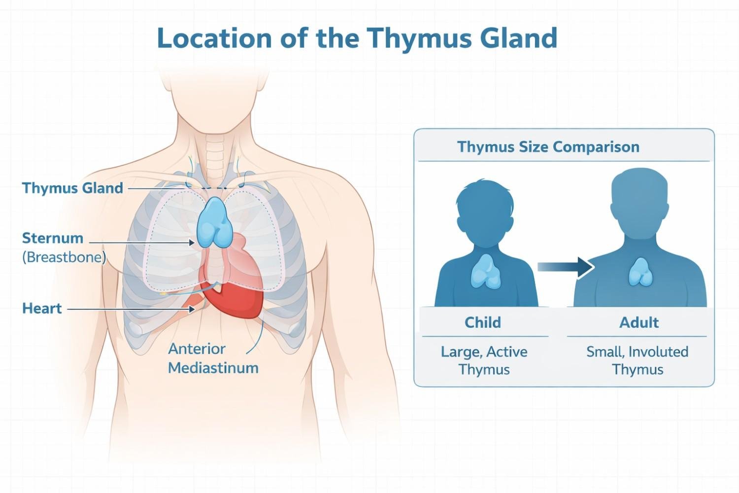 The thymus is a small, butterfly-shaped gland. It sits right behind your breastbone, just above your heart. During childhood, it plays a major role in building your immune system. It trains a type of white blood cell called T-lymphocytes to fight infections.