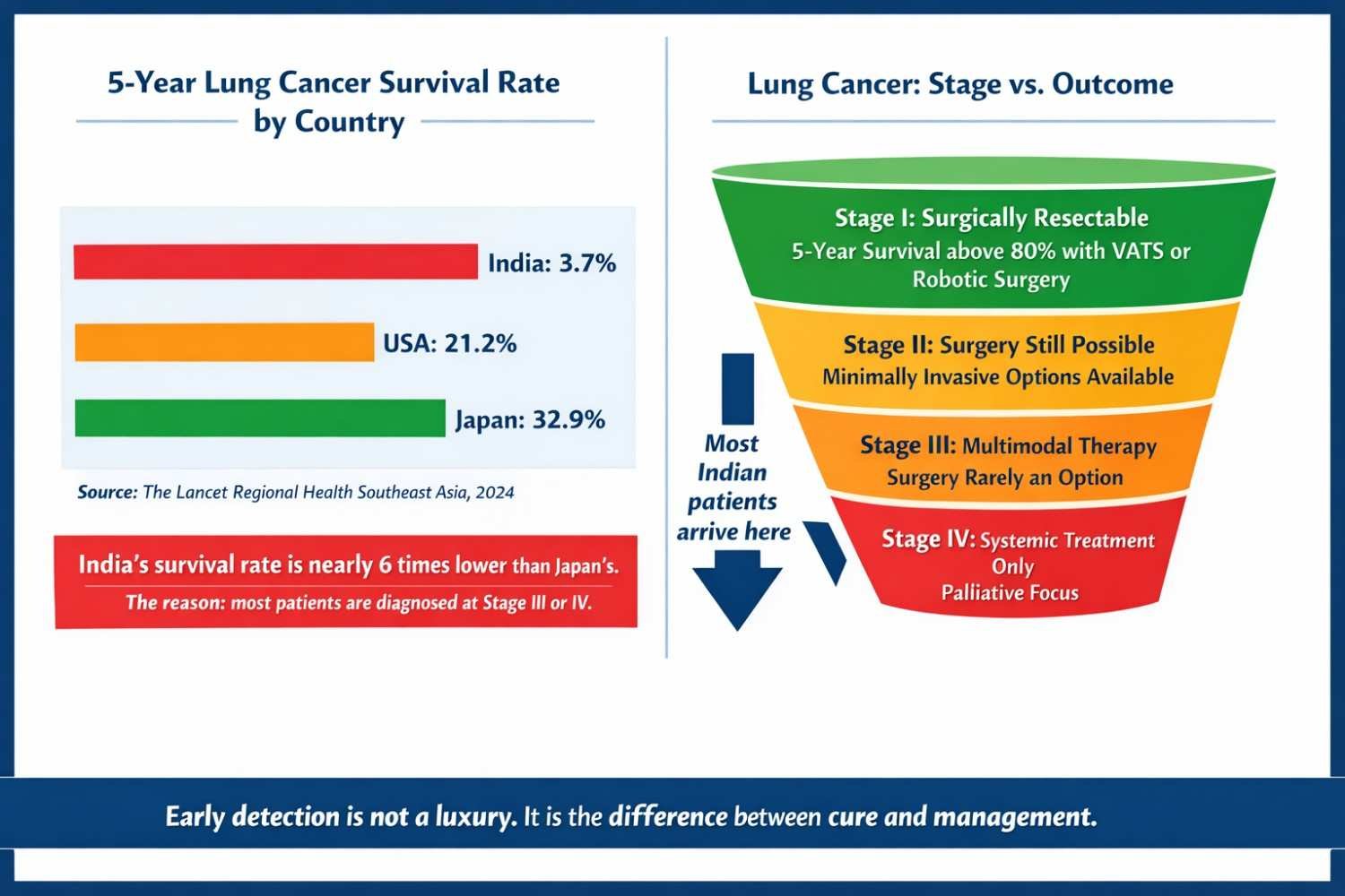 Here is a fact I share with every patient's family: lung cancer caught at Stage I or Stage II is a surgically treatable disease. According to The Lancet Regional Health Southeast Asia (2024), the age-standardised 5-year survival rate for lung cancer in India is only 3.7%, compared to 21.2% in the USA and 32.9% in Japan. That gap is almost entirely explained by the stage at which patients arrive.